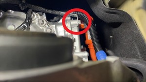 滑动红色连接器锁片,打开黑色释放杆,然后断开后驱动单元左侧高压线束与高压电池的连接。