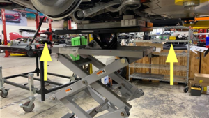 - 稍稍降下副车架举升机,使车身和副车架之间留有约 60 毫米的间隙。