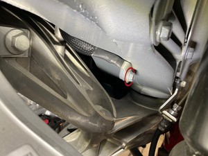将左后震动软管安装到左后下方控制臂,然后安装将震动软管固定到控制臂的螺栓。