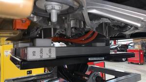 - 在后驱动单元和副框架举升机之间布置一个棘轮带,然后用此棘轮带将驱动单元固定到举升机。