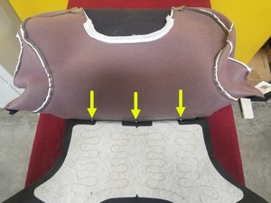 使用切割器切断将右侧第二排椅背饰板固定到第二排椅背泡沫的前拱环(3 个)。