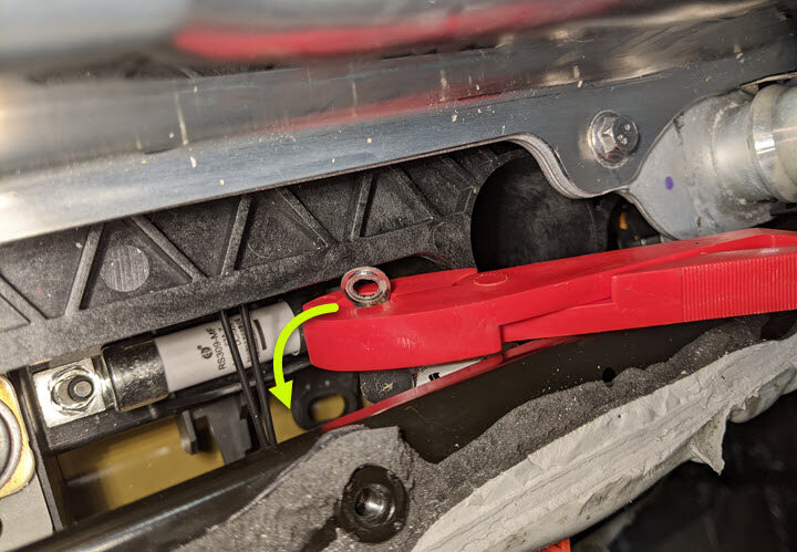 - Use the HV insulated pick together with the fuse puller to carefully move the A/C compressor fuse out from under the electrical harness wires, and out of the front bay of the HV battery.