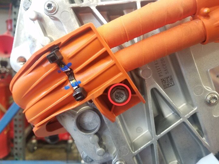 安装将高压电池至后驱动单元高压线束固定到后驱动单元的螺栓。