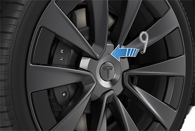 - 将轮毂螺母罩工具(如果配备)(在某些车辆中位于手套箱内,或者您也可以使用小号内六角扳手)的弯曲部插入 Tesla“T”徽标底部处的孔内。