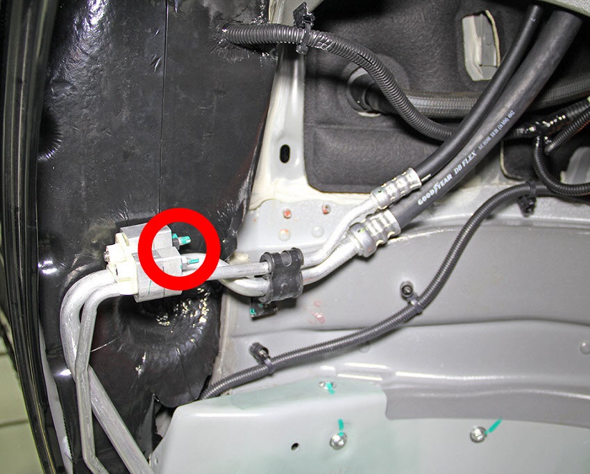 - Remove the nuts (x2) that secure the rocker high/low pressure pipes to the rocker-to-rear-HVAC high/low pressure pipes (torque low pressure side 20 Nm, torque high pressure side 10.5 Nm).