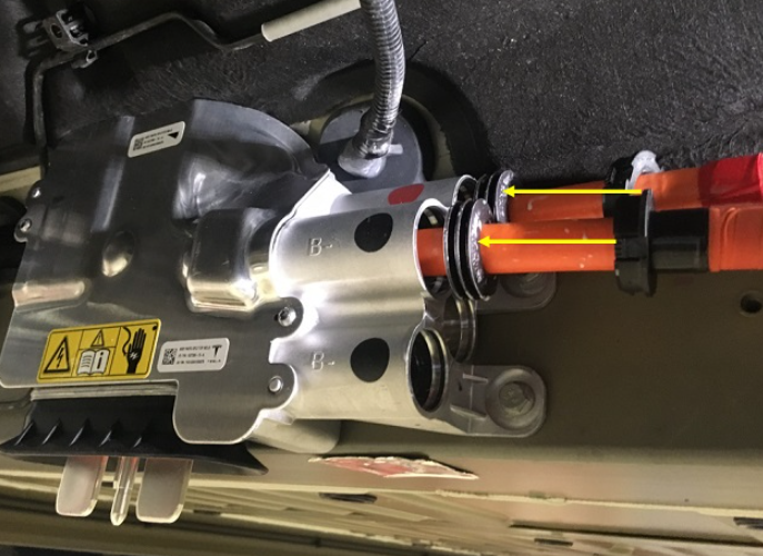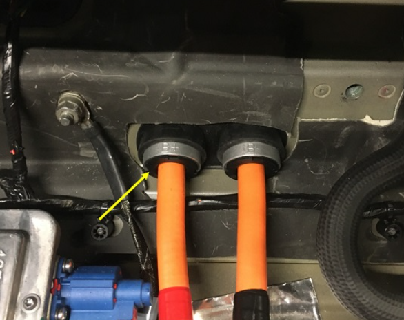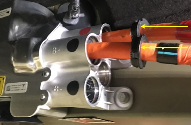 - Use snap ring pliers to install the retaining collar on the B- charger HV cable.