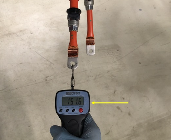 - Use a force gauge to perform a 150 N pull test on the B+ and B- RDU HV cables.