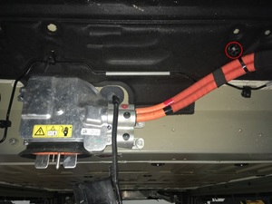 - Install the bolts (x2) that secure the HV cable bracket to the body of the vehicle (torque 7 Nm).