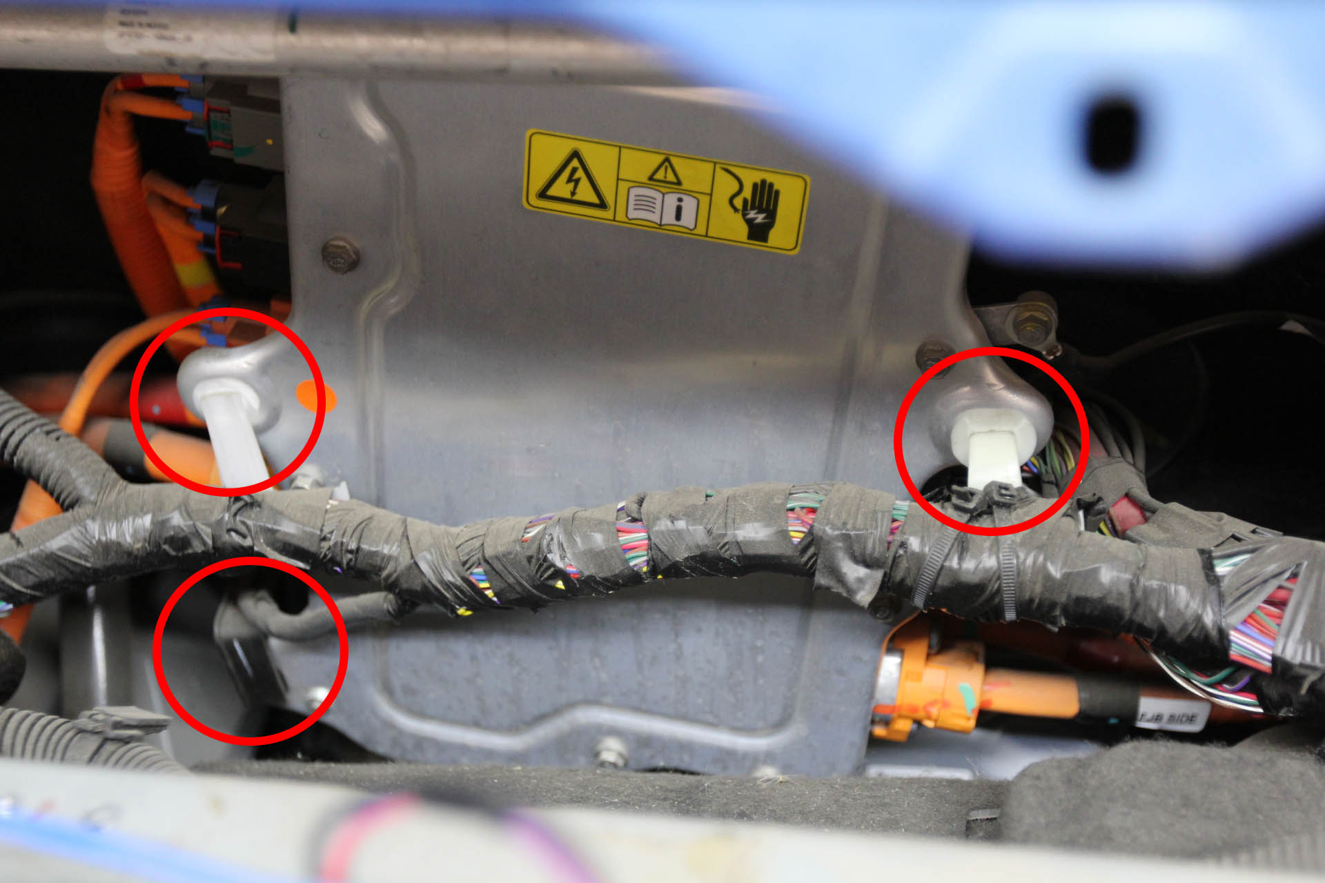 - Install the clips (x4) that attach the 12V harness to the front junction box and air suspension enclosure.
