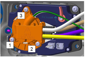 NoteThe rear HV cable has a slotted lug that surrounds a tab in the charger; use a suitable tool to pry the lug inboard to maneuver it around the tab before completely removing the cable out from the charger.
