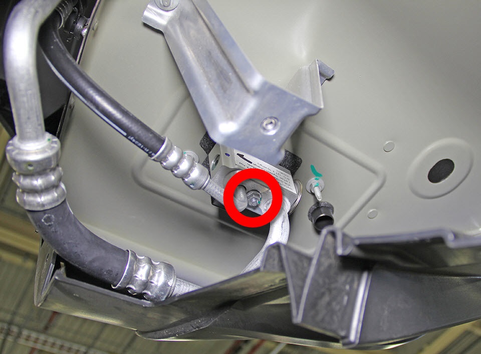 - Remove the nut that secures the rocker-to-rear-HVAC high/low pressure pipes to the rear TXV valve (torque 10.5 Nm).