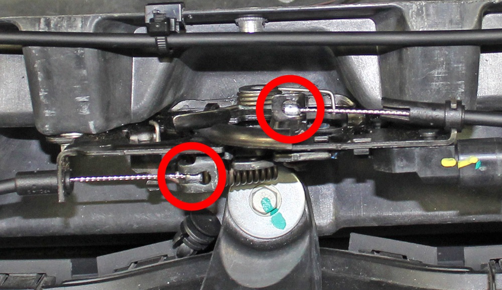 - Release both hood latch cables (x2) from the latch assembly.