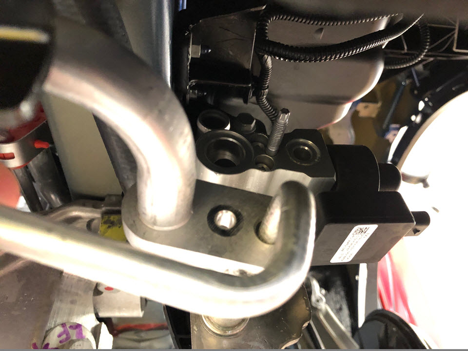 - Disconnect the pressure sensor electrical connector on the suction liquid jumper A/C line.