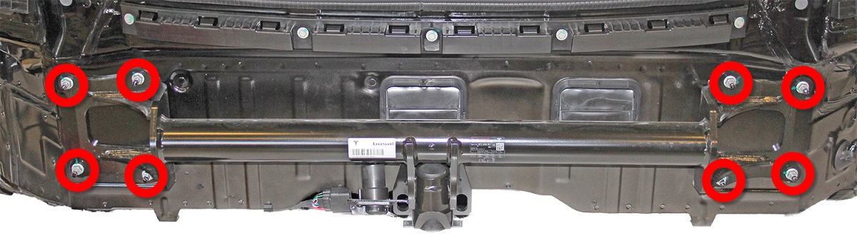 - Remove the nuts (x8) that secure the trailer hitch to the studs on the body (torque 65 Nm).