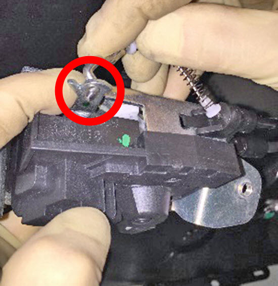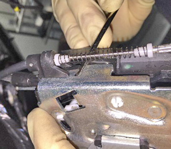 - Use a pick to release the cinching cable from the retaining clip on the latch assembly.