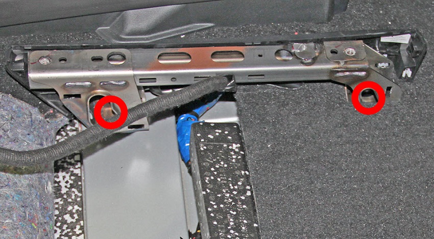 Remove and discard the bolts (x2) that secure the inner seat riser to the body of the vehicle (torque 34 Nm). Remove the washers (x2).