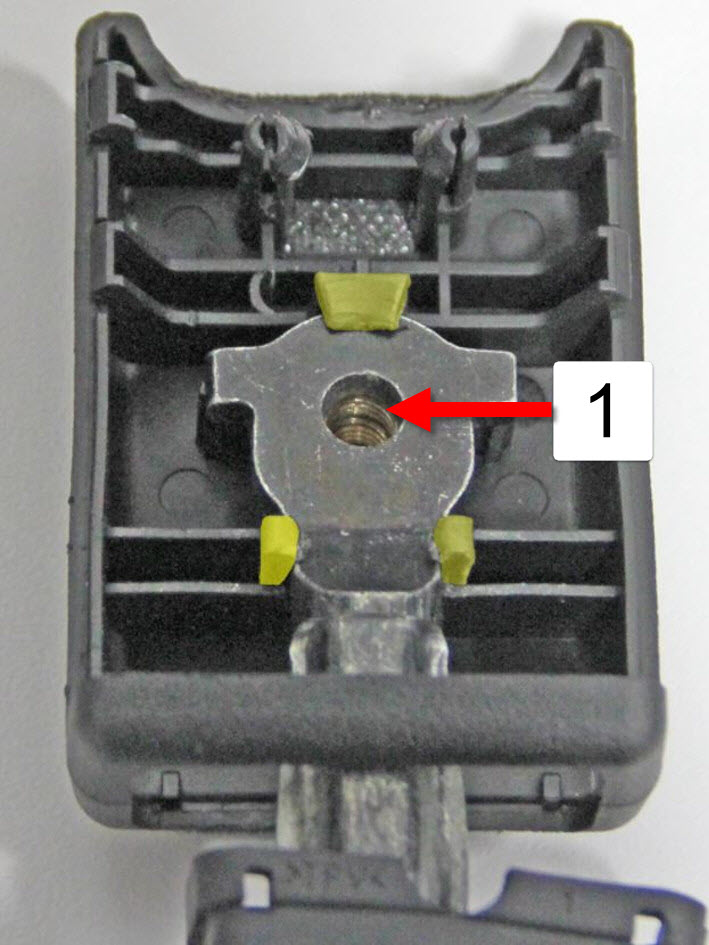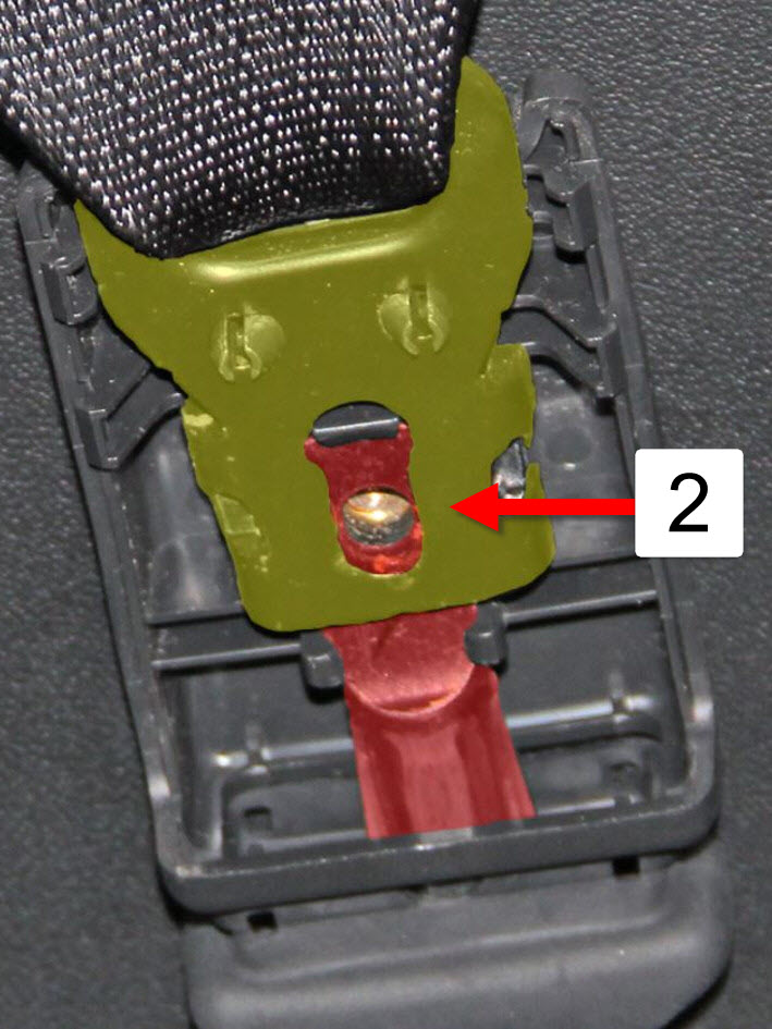 | 2 | Fixed end of the seatbelt aligned over the pretensioner and bolt hole |