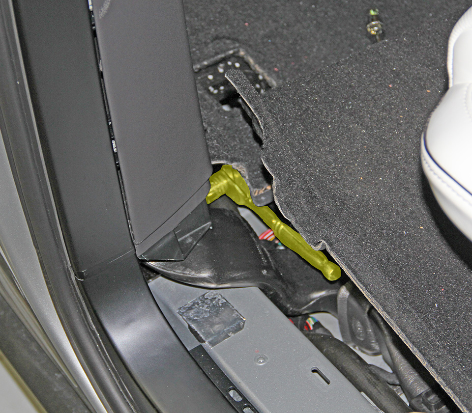 - Use a trim tool to remove the plastic cap that covers the pretensioner anchor bolt on the LH 1st row seatbelt.