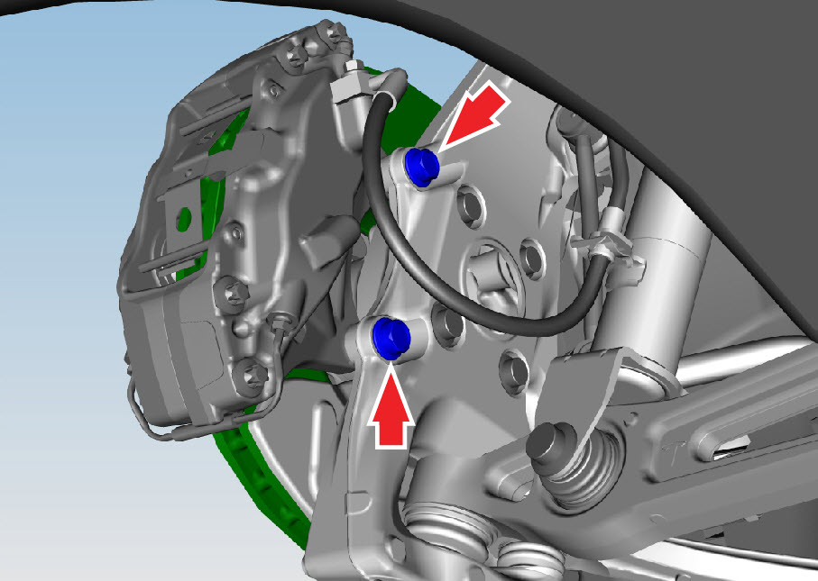 - Remove and discard the bolts (x2) that secure the caliper to the knuckle (torque 120 Nm).