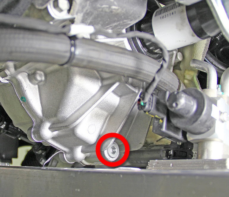 Release the acoustic cover from the front drive unit to gain access to the drain plug.