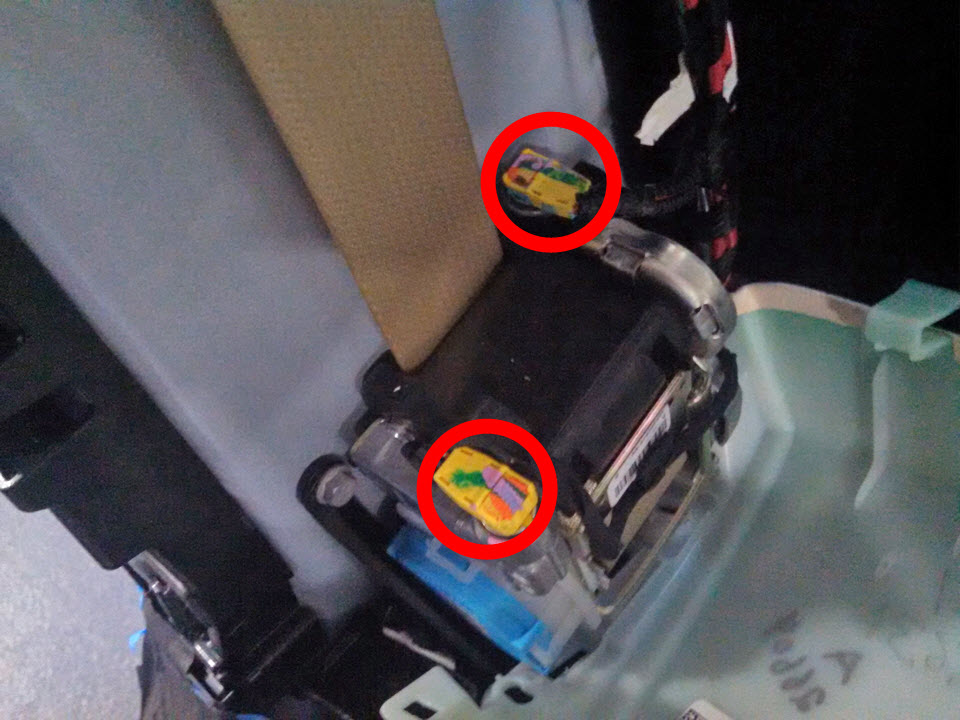 - Remove the screws (x2) that secure the seatbelt webbing guide to the B-pillar (torque 2.4 Nm).