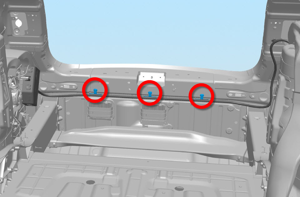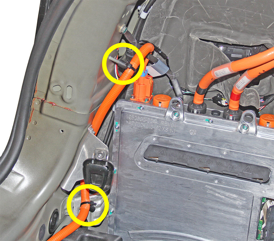 - Release the fir tree clips (x3) that secure the HV cable to the rear trunk wall.