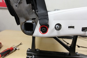 NoteFeed seat belt through seat cushion pass through, lift trim subassembly to release from the frame