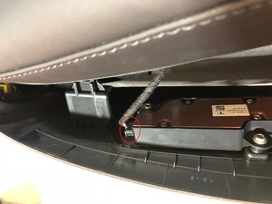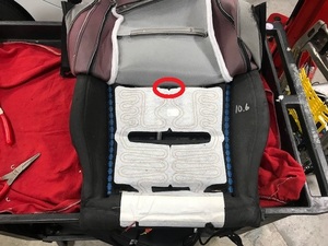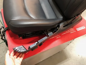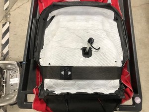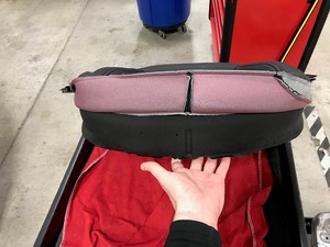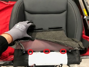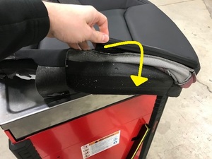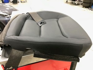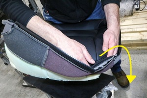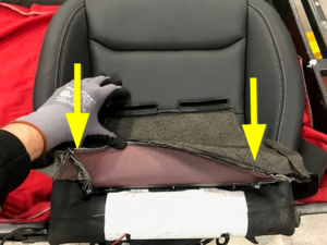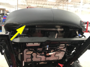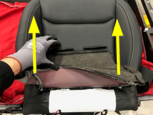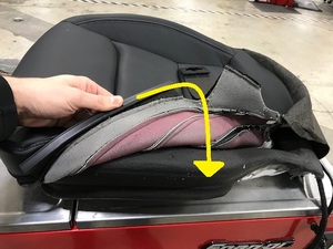 - Roll LH seat bottom upholstery front corner and then side over seat cushion foam