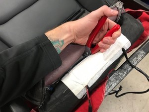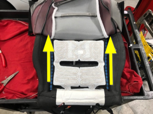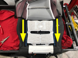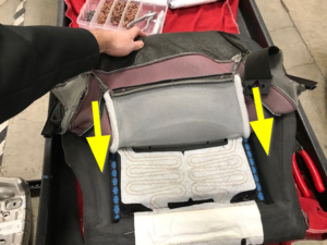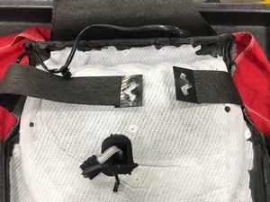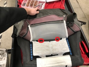 - Roll RH seat bottom upholstery front corner and then side over seat cushion foam