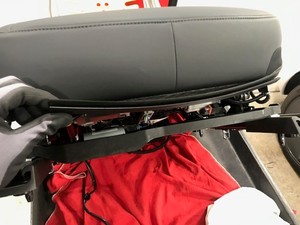 Firmly press both sides of seat bottom upholstery velcro into inboard channels of seat cushion foam