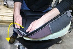 NotePull the seat bottom upholstery trim back with one hand and push on the Velcro from inside with the other, Push the Velcro into the channel until it is firmly attached, Working your way from back of seat cushion foam to the front