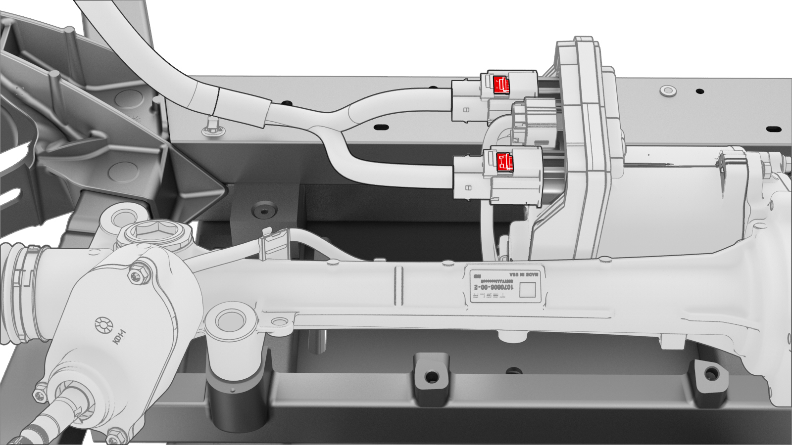Slowly lower the front subframe assembly to gain access to the power and ground electrical connectors for the steering rack, and then disconnect both electrical connectors.