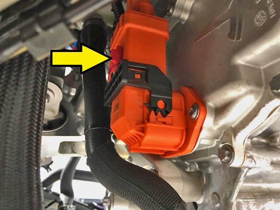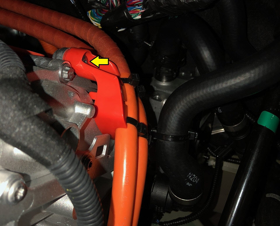 - Remove the bolt that attaches the Front Junction Box (FJB)-to-front drive unit HV harness to the front drive unit.