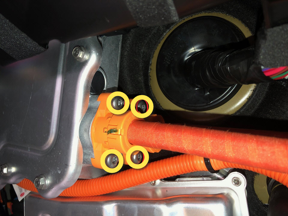 - Install new bolts (x4) that attach the FJB-to-front drive unit HV harness to the FJB (torque 7 Nm).