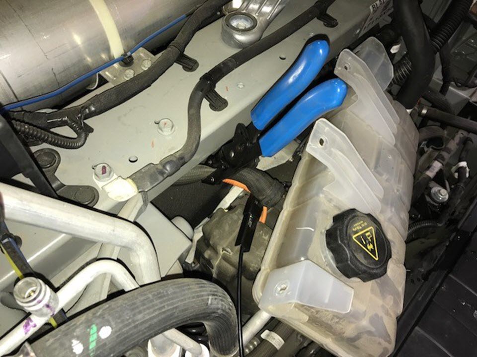 - Release the 12V harness clip from the coolant reservoir.