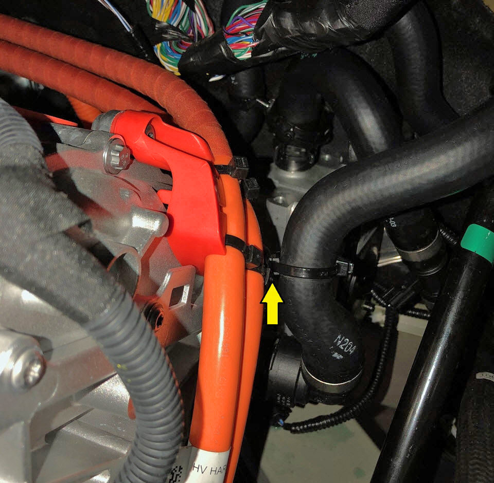 - Remove the clip that attaches the front drive unit inlet coolant hose to the HV harness bracket.