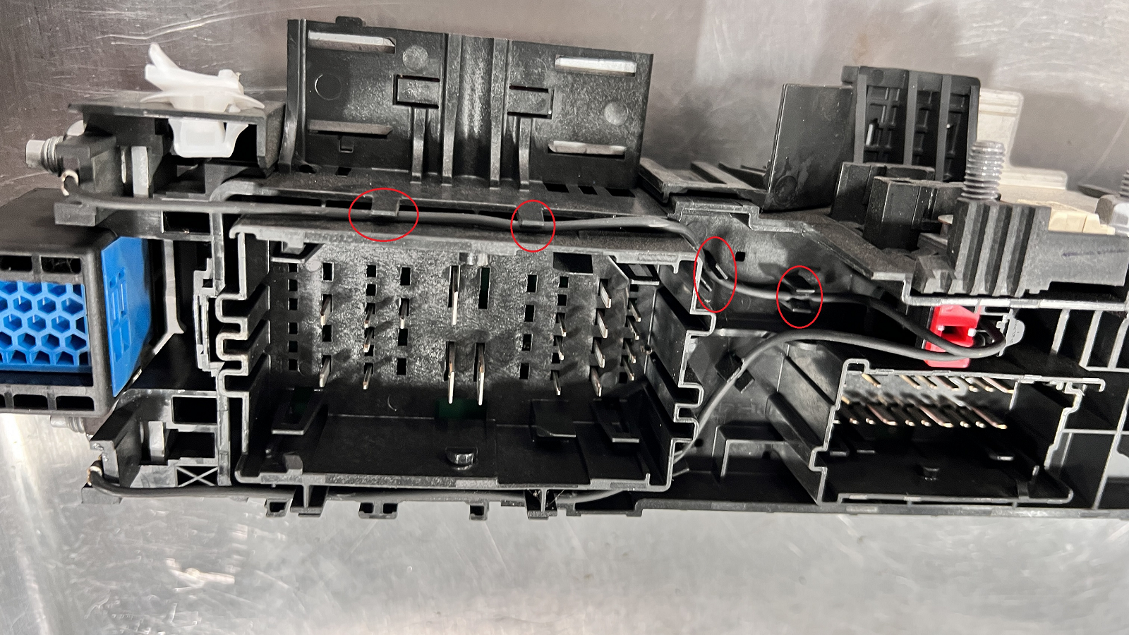 - On the new (replacement) fuse box, install the wires to the underside of the fuse box housing.