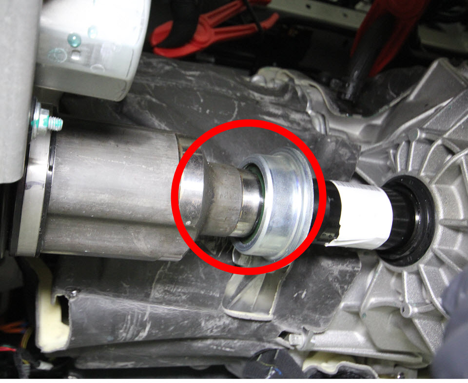 - Align the LH halfshaft so that the opening in the snap ring is down, facing towards the bottom of the front drive unit.