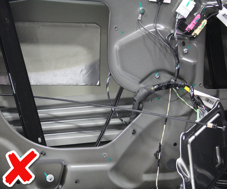 Always replace plugs or tape removed from the front door shells when servicing or inspecting the door or its components. Additional holes in the door creates more escape paths for air, which decreases the front door pressure sensor's ability detect a side impact, and can negatively affect airbag deployment.