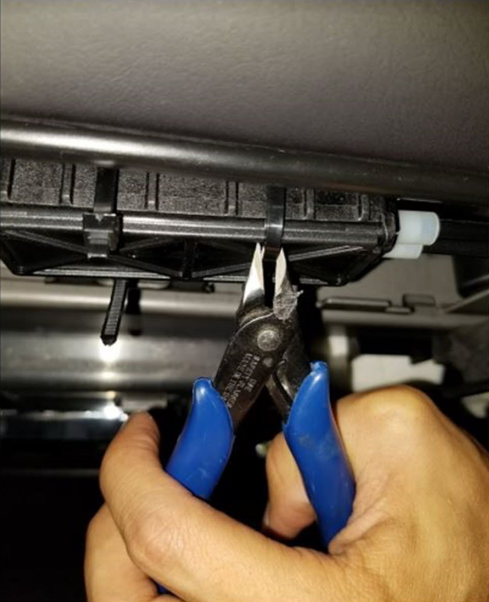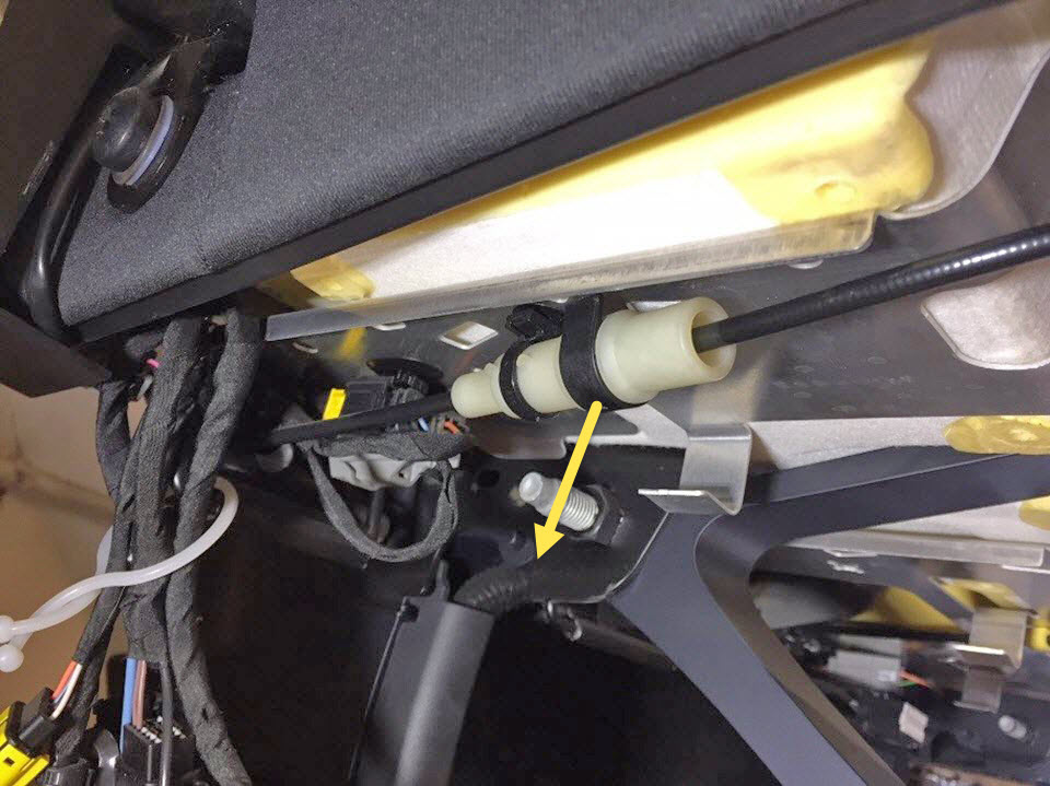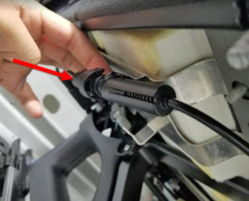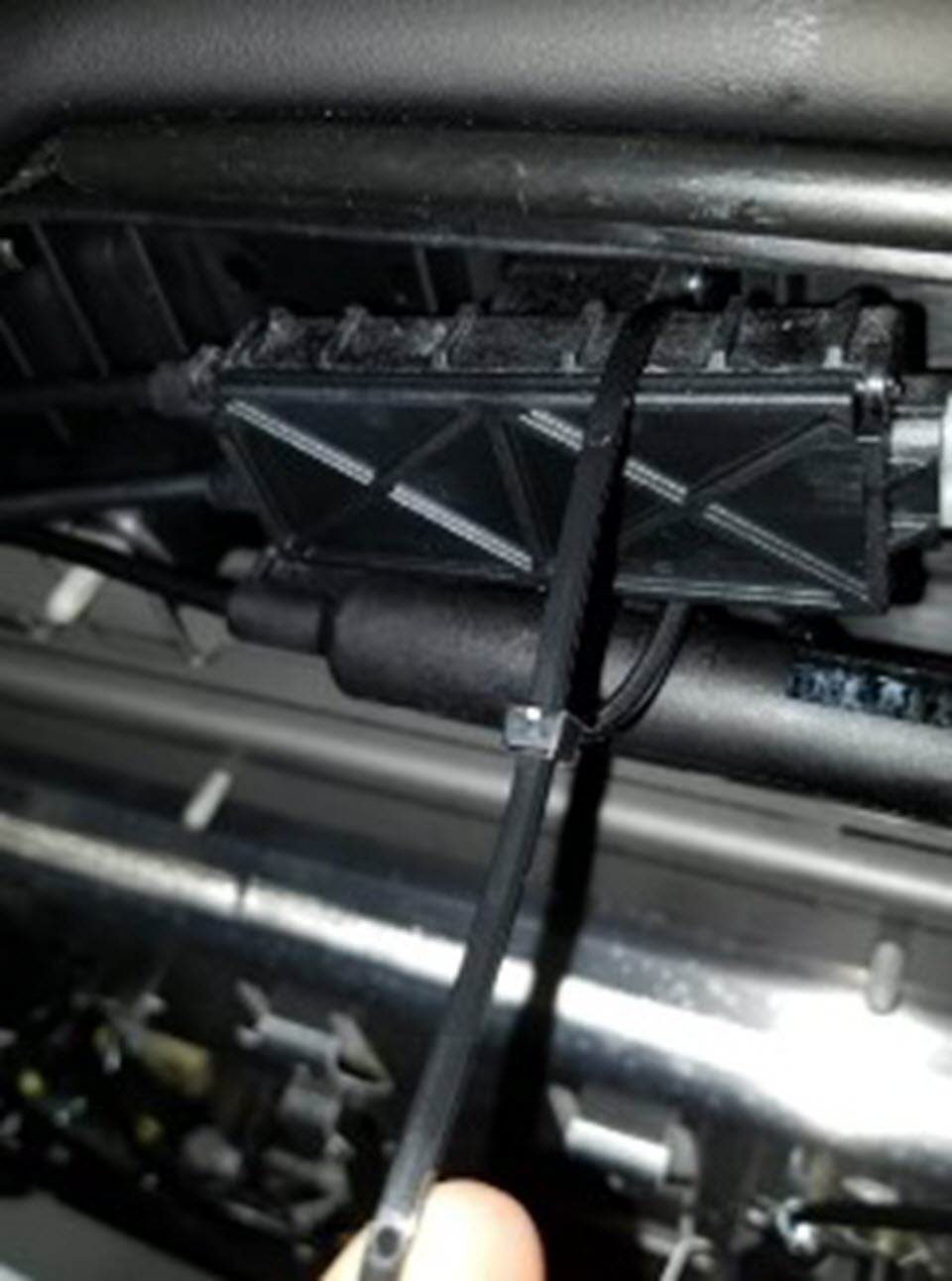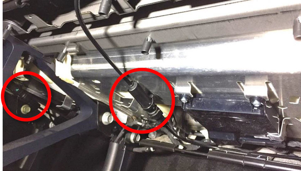 - Remove the cable ties (x2) that attach the 2nd row latch cable splitter box to under the seat.
