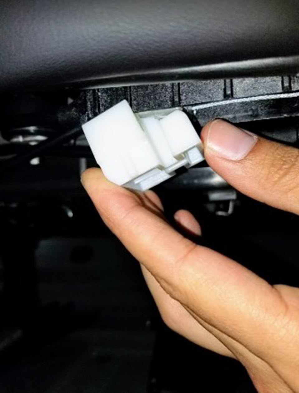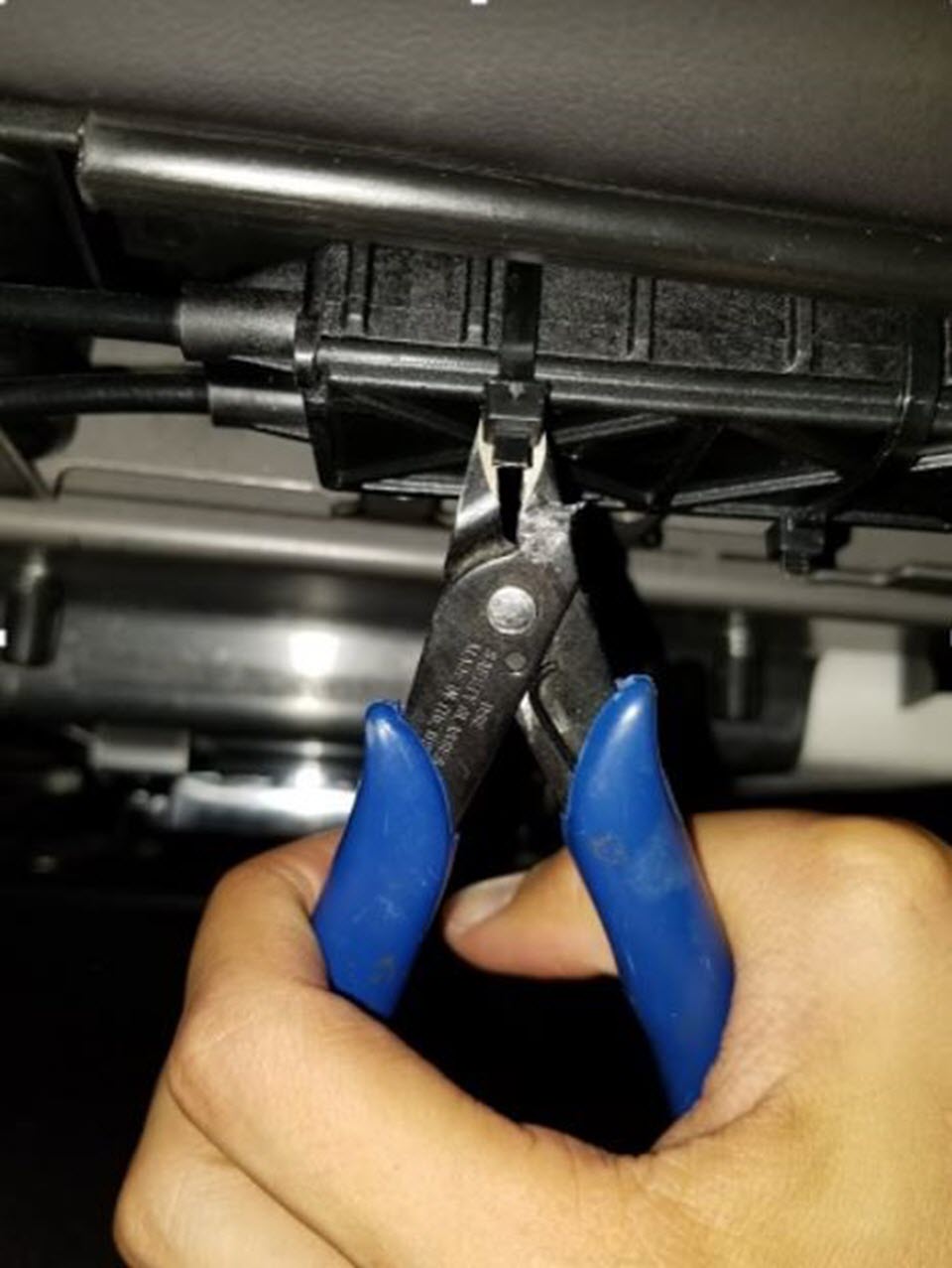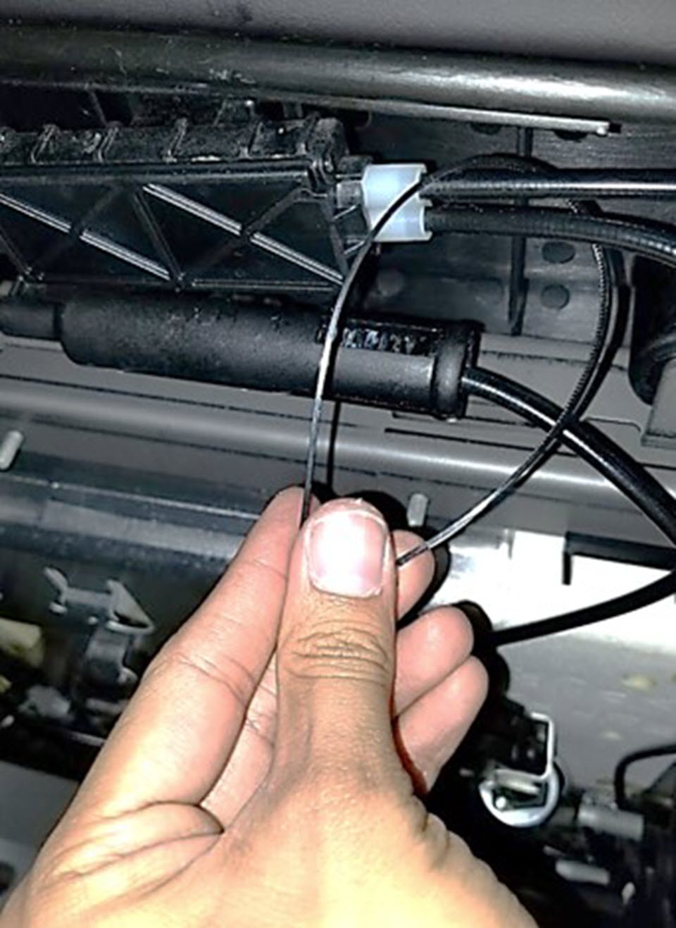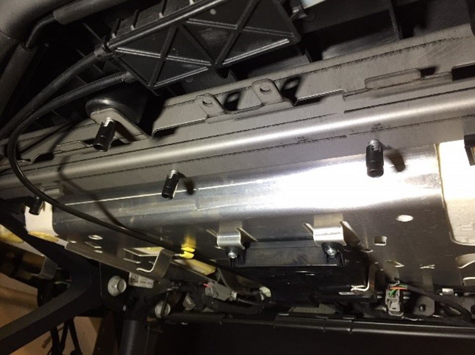 - Remove the cable ties (x2) that attach the 2nd row latch cable splitter box to under the seat.