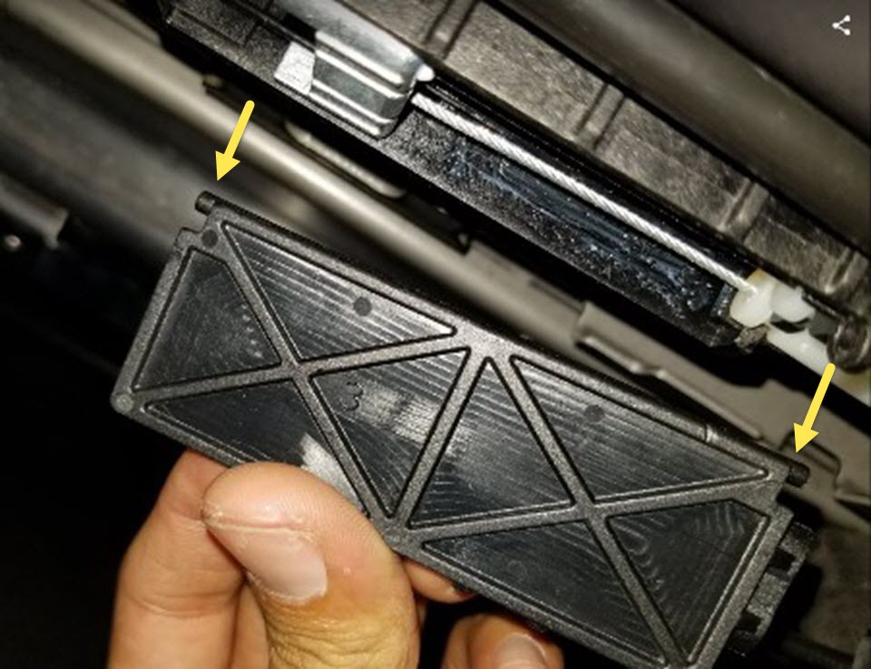 - 1st generation seat: Release the tabs (x2), and then pull the lock down to release the locking clip from the RH recliner adjuster.
