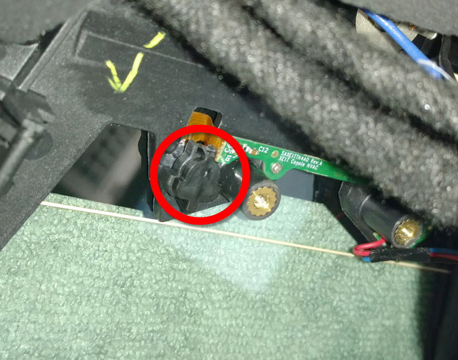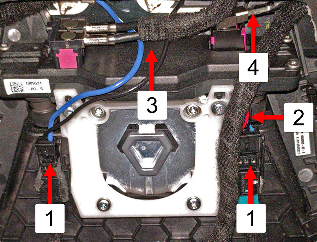 - Connect the harnesses. Affix the connectors to the double-sided foam tape on the underside of the glare shield.