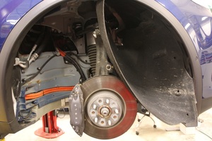 - Remove the nut (torque 6 Nm) and clips (x5) that attach the rear part of the RH front arch liner, and then move away the rear part of the arch liner for access.