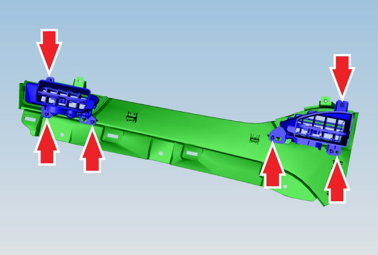 - Remove the screws (x6) that secure the face level vents to the instrument panel finisher (torque 1.2 Nm).