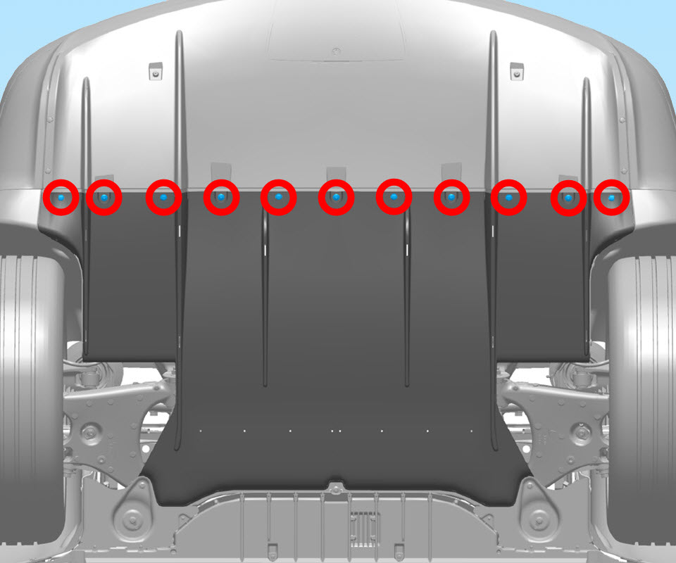 - Remove the bolts and washers (x11) that secures the mid aero shield to the rear fascia (torque 4 Nm).