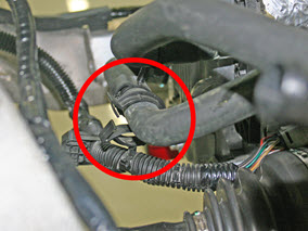 - Release the clip that attaches the low voltage harness to the coolant hoses.
