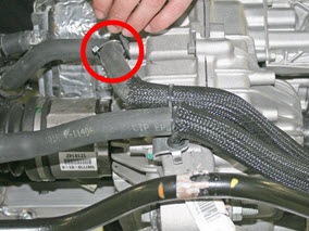 - Release the clip that attaches the coolant hoses to the rear subframe.