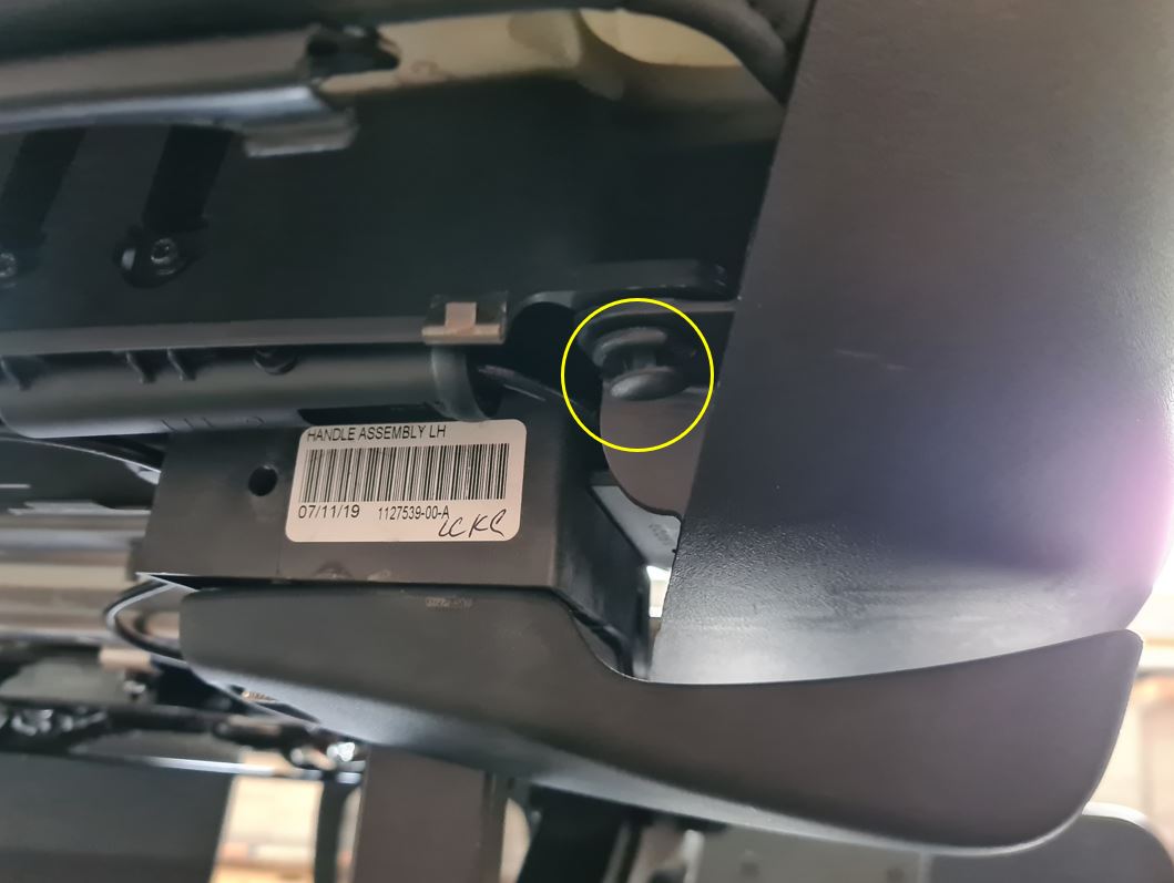 - Push the outer side of the LH seat cushion inward and loosen the spring clip of the seat assembly release handle, and then remove the release handle.