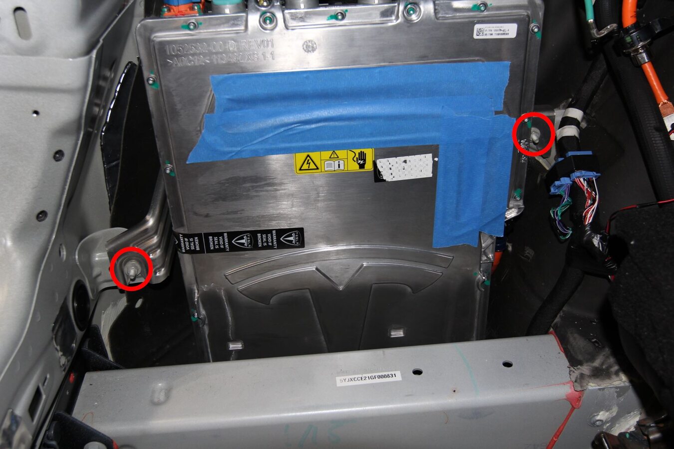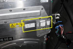 - Lift the charger up, and then remove and discard the bolts (x2) that attach the HV cables to the rapid splitter at the bottom of the charger.